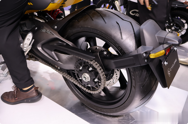 除此之外,细节上也能够看到该车裸露的黄色钢管车架和公升发动机,肌肉感和力量感十足,充满着“狂野气息”,和大魔鬼有着同样的既视感。在车身设计上,该车拥有120mm前胎和240mm超宽后胎,视觉效果拉满。当然,在高速骑行时,其稳定性表现也会更加出色。